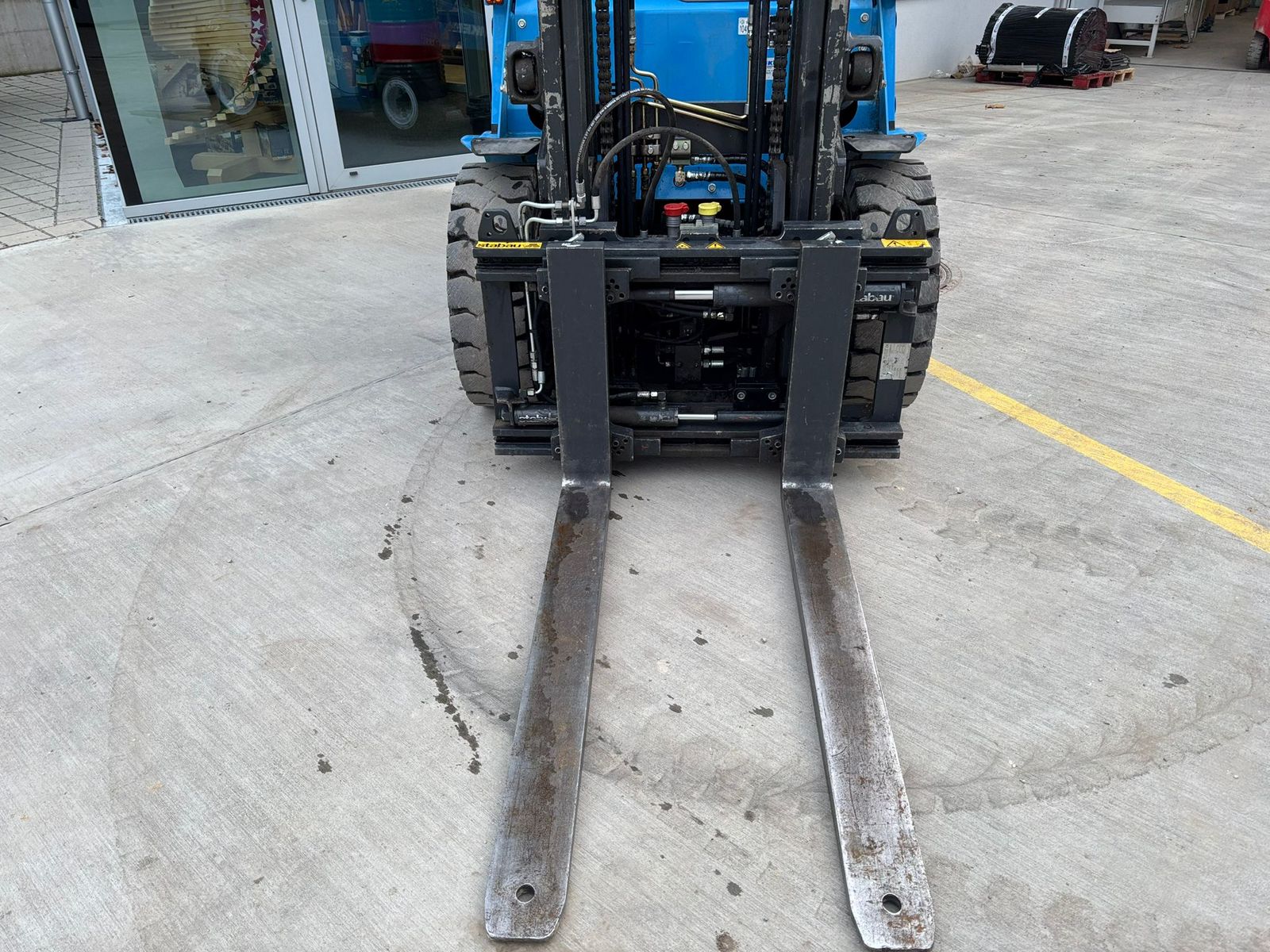 - Seitenschieber: Integriert, 1000 mm, inkl. Lastschutzgitter, mit hydr. Zinkenverstellung